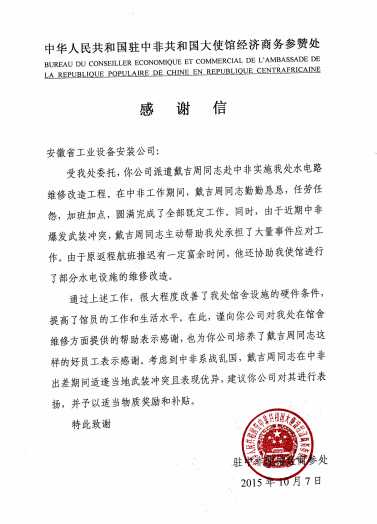 近日,公司收到中華人民共和國駐中非共和國大使館經濟商務參贊處發來的感謝信,信中對我公司戴吉周同志在駐中非使館經商參處水電路維修改造工程中的優異工作表現表示衷心感謝。
