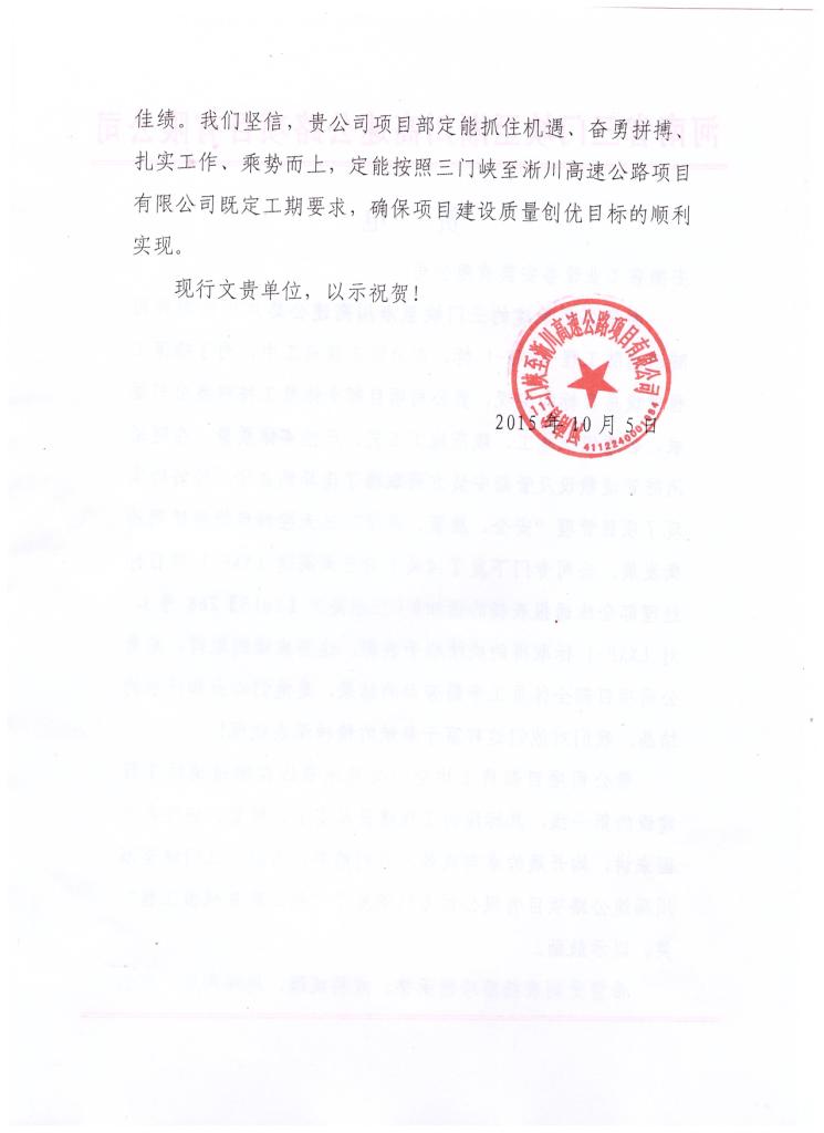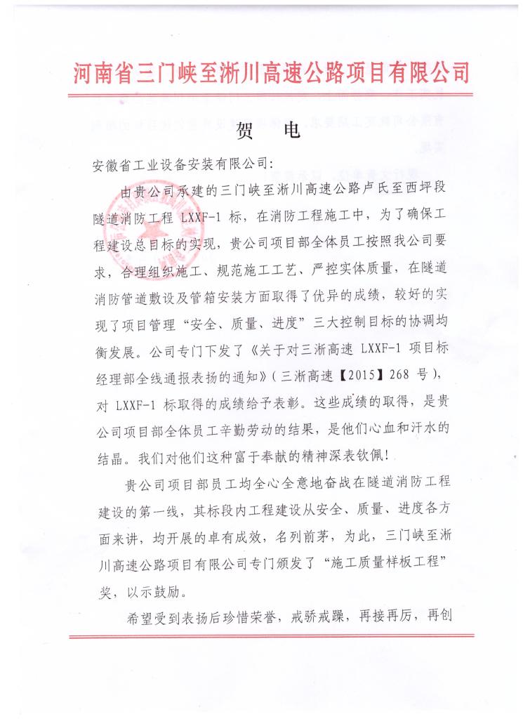 10月5日,公司收到河南省三門峽至淅川高速公路項目有限公司發來的賀電,信中對公司西北分公司在承建三門峽至淅川高速公路盧氏至西坪段隧道消防工程LXXF-1標施工中,項目部合理組織施工、規范施工工藝、嚴控實體質量,較好地實現了項目“安全、質量、進度”三大控制目標協調均衡發展表示高度贊揚,對項目部全體員工辛勤勞動、無私奉獻表示衷心感謝,并給予表彰和獎勵。