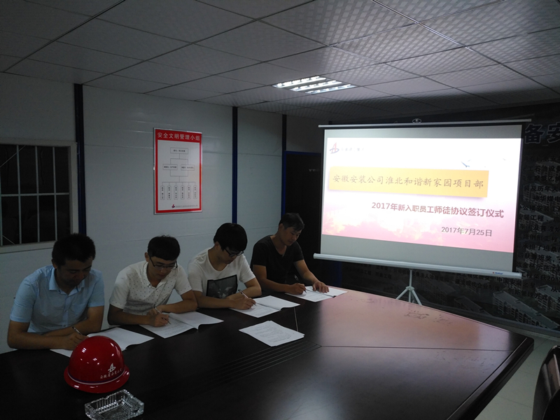 7月25日晚,安徽安裝公司淮北和諧新家園項目部精心策劃,嚴密組織,精選出思想作風扎實,工作經驗豐富,專業素質過硬的老師傅與新入職員工舉行莊重的師徒協議書簽訂儀式。