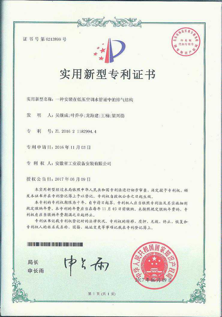 近日,由安徽安裝公司申報的《一種安裝在低壓空調水管道中的排氣結構 》實用新型項目,正式獲得國家知識產權局授權,并頒發了實用新型專利證書(專利號:ZL201621182994.4)。這是繼《一種便攜式施工現場臨時用電聯排插座》之后獲得的第二項專利。