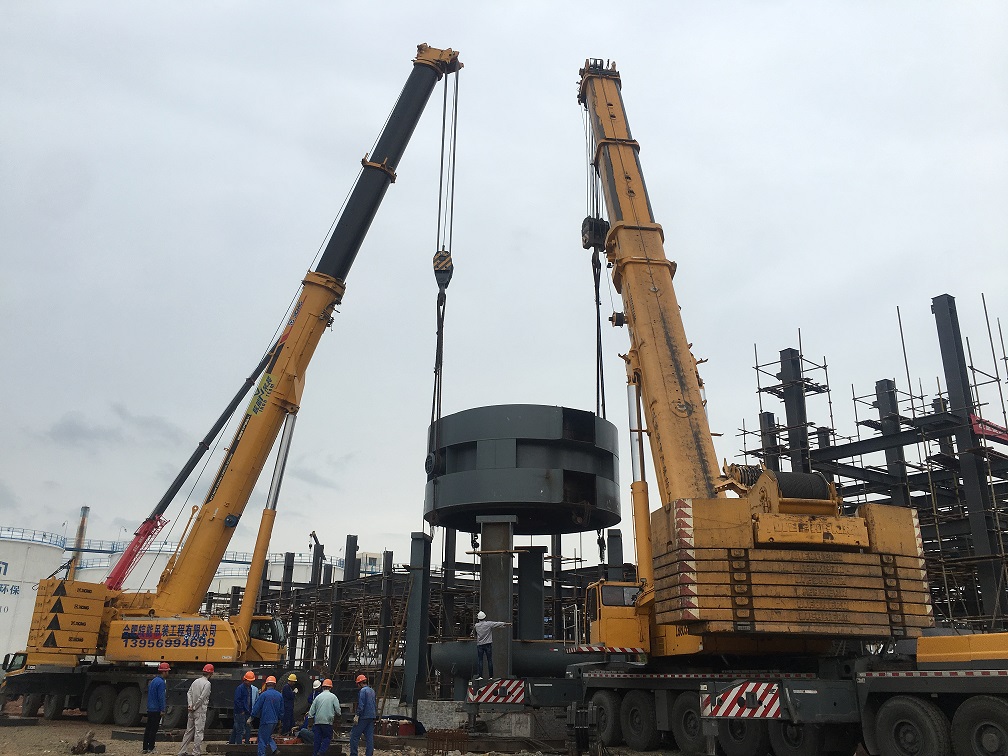 本次吊裝的反應(yīng)器中段部分重達(dá)220噸,分公司領(lǐng)導(dǎo)高度重視,吊裝前期,邀請(qǐng)公司總工吳繼成、總工辦主任牛守義和安全部王岳濤經(jīng)理親臨項(xiàng)目部參與設(shè)備吊裝的專題方案討論定稿工作。當(dāng)日上午,吊裝現(xiàn)場(chǎng)準(zhǔn)備工作緊張卻又有條不紊的進(jìn)行,項(xiàng)目經(jīng)理李子鳳向全體“參戰(zhàn)”員工進(jìn)行了安全交底,工作人員對(duì)兩臺(tái)分別為500T、350T吊車的站位及性能再次確認(rèn),現(xiàn)場(chǎng)機(jī)具、人員均按既定方案實(shí)施。分公司經(jīng)理史崇松、業(yè)主單位負(fù)責(zé)人、監(jiān)理全程在現(xiàn)場(chǎng)“督戰(zhàn)”,全體工作人員經(jīng)過四個(gè)小時(shí)的奮戰(zhàn),吊裝作業(yè)圓滿結(jié)束。