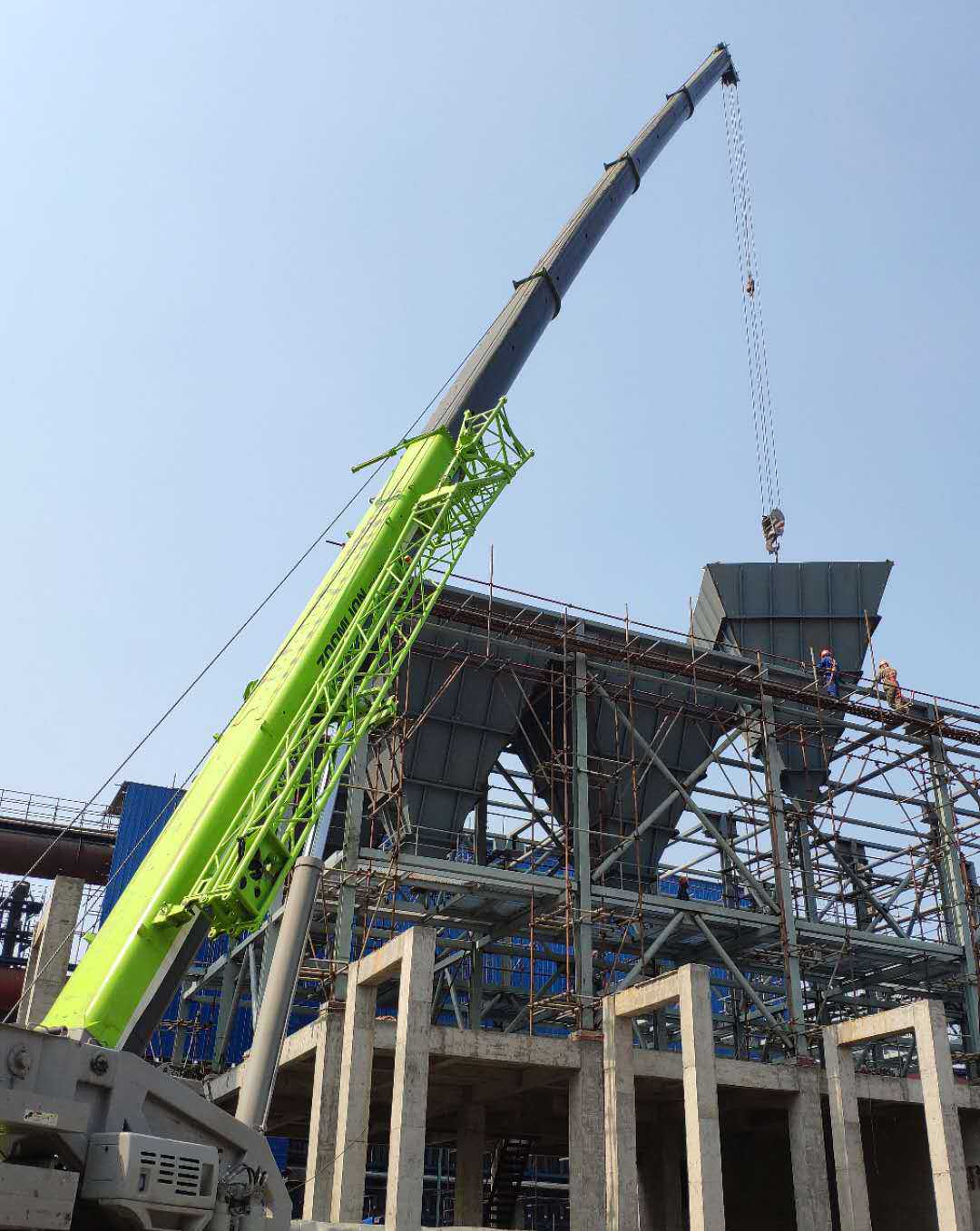 本次吊裝的反應器灰斗部分總重量達56噸,吊裝作業存在場地狹小、與土建單位交叉作業多、吊重荷載大等諸多困難,吊裝任務異常艱巨。為此,項目部提前合理部署,多次優化吊裝方案,按照方案要求采用額定荷載為100噸的汽車實施吊裝作業。項目部在設備吊裝前對全體“參戰”人員進行了現場安全技術交底,明確施工工序、技術要點難點和安全風險點,做到分工明確、責任到位,吊裝工作有條不紊地展開。在各方力量的通力配合下,經過六個多小時的奮戰,項目部終于完成了10臺灰斗以及現場輔助設備的吊裝任務。