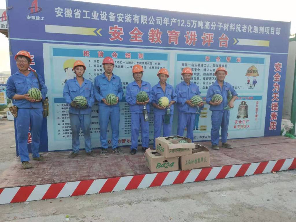 副總經(jīng)理王軍十分重視現(xiàn)場一線人員防暑降溫和工人的保障工作,多次電話詢問現(xiàn)場防暑降溫工作,項目部管理人員帶著公司領(lǐng)導(dǎo)對項目部工人們身體健康和安全生產(chǎn)的殷切期盼,把防暑降溫物品親自送到工人手里。一個個西瓜、一瓶瓶純凈水、一句句問候,表達了公司關(guān)心員工、體恤員工的一片情意,給炎炎夏日帶來一縷清涼。