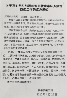一是組織到位。1月26日,安徽安裝公司下發《關于成立新型冠狀病毒感染肺炎疫情防控工作領導小組的通知》,負責貫徹落實上級關于新型冠狀病毒感染肺炎疫情防控工作的重大決策部署,負責安徽安裝公司新型冠狀病毒感染肺炎疫情防控工作的領導,研究解決安徽安裝公司疫情防控中的重大問題,統籌組織防控處置。