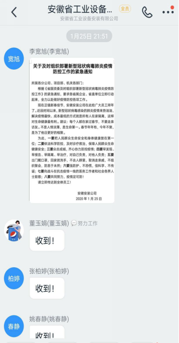 二是部署到位。疫情防控工作開展后,1月25日(大年初一)安徽安裝公司發出防控疫情工作的緊急通知,1月27日制定肺炎疫情防控措施,對疫情防控工作進行細化安排,周密部署。要求各分公司、直屬項目部、各部門要以對職工群眾生命安全高度負責的態度,精準施策,堅決遏制疫情在安徽安裝公司輸入、蔓延,鼓勵職工戴口罩、勤洗手、多通風、少走動、常消毒。