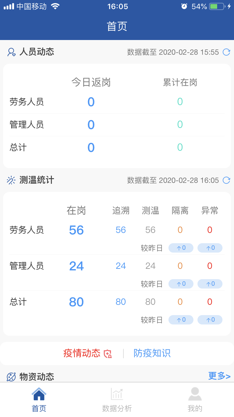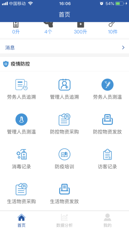 項(xiàng)目全面推行“返崗復(fù)工疫情防控系統(tǒng)”APP。主頁面包括勞務(wù)人員追溯、勞務(wù)人員測(cè)溫、防控物資采購、消毒記錄、疫情培訓(xùn)等11個(gè)專題版面,通過這些功能可線上及時(shí)填報(bào)人員返崗日期、體溫、癥狀及是否為留守人員等詳細(xì)信息,還有項(xiàng)目部的疫情物資采購情況、環(huán)境衛(wèi)生的消殺情況等相關(guān)信息,使上線人員時(shí)時(shí)了解疫情防控動(dòng)態(tài),充分借助信息技術(shù)手段,全力打贏疫情防控“戰(zhàn)役”。 借助這一平臺(tái)確保項(xiàng)目部實(shí)時(shí)、準(zhǔn)確、有效地掌握現(xiàn)場(chǎng)人員的健康情況,助力疫情防控工作。