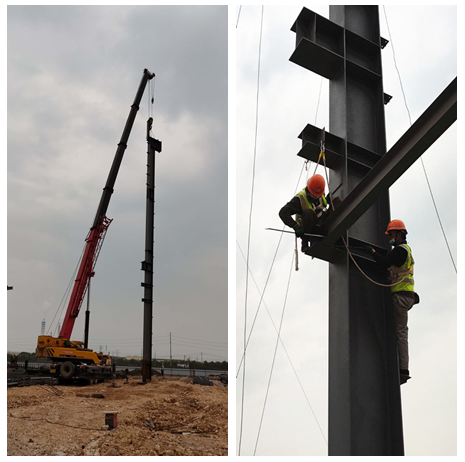 伴隨著隆隆的吊車轟鳴聲,閃爍的電焊火花,縱橫交錯的鋼構架拼裝,一道道工序正在有條不紊的進行著……這是走進蕪湖宇培年產50萬方建筑工業化構件生產基地項目鋼結構工程,看到的一片繁忙施工景象。因受疫情的影響,項目部2020年3月5日接到總包的復工復產通知,3月6日立即組織召開復工會議,全面部署“防疫”舉措和生產任務。在做好施工必備的人、材、機進場和安全教育及技術交底后,3月11日,當第一根27米高的廠房跨立柱穩穩地吊裝成功后,項目部全面啟動,按下搶工“快進鍵”。