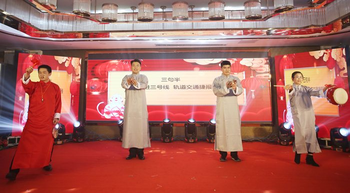 整場聯(lián)歡會(huì)由歌伴舞、朗誦、合唱、小品、樂器演奏、三句半、黃梅戲、音詩畫等16個(gè)節(jié)目組成,均為職工自編自導(dǎo)自演。在歌伴舞《今天是你的生日中》中,聯(lián)歡會(huì)正式拉開序幕。《省安贊》以改編版黃梅戲劇的形式為公司送上美好的祝愿;配樂詩朗誦《春風(fēng)浩蕩啟新程,揚(yáng)帆起航再出發(fā)》展現(xiàn)了安徽安裝人團(tuán)結(jié)奮進(jìn),一往無前的精神風(fēng)貌;三句半《拼搏奮進(jìn)三號(hào)線,軌道交通捷報(bào)傳》以幽默的方式講述了軌道交通3號(hào)線合肥大劇院站項(xiàng)目部上的故事;音詩畫《奮斗是青春最亮麗的底色》講述了新疆烏蘇管廊、中水回用項(xiàng)目榮獲“安徽省工人先鋒號(hào)”背后的故事,向全體奮戰(zhàn)在項(xiàng)目施工一線的安徽安裝人致敬...歡快的旋律,優(yōu)美的舞姿,幽默的小品,豪邁的朗誦將現(xiàn)場的氣氛推向高潮,贏得了現(xiàn)場觀眾的歡呼喝彩與陣陣掌聲。