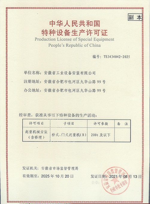 近日,安徽安裝公司起重機(jī)械制造許可證換證工作順利完成。