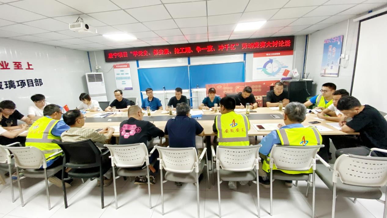 為貫徹落實集團公司“學黨史、保安康、搶工期、爭一流、沖千億”主題勞動競賽活動精神,6月29日上午,安徽安裝公司在蚌埠康寧項目部會議室開展“學黨史、保安康、搶工期、爭一流、沖千億,大干60天,確保完成節點目標”的勞動競賽大討論活動。公司副總經理劉安俊,公司紀委書記、工會主席李寬旭,公司工程管理部經理龍海健,蚌埠分公司領導班子成員,康寧項目部人員等30人參加了會議,會議由李寬旭主持。