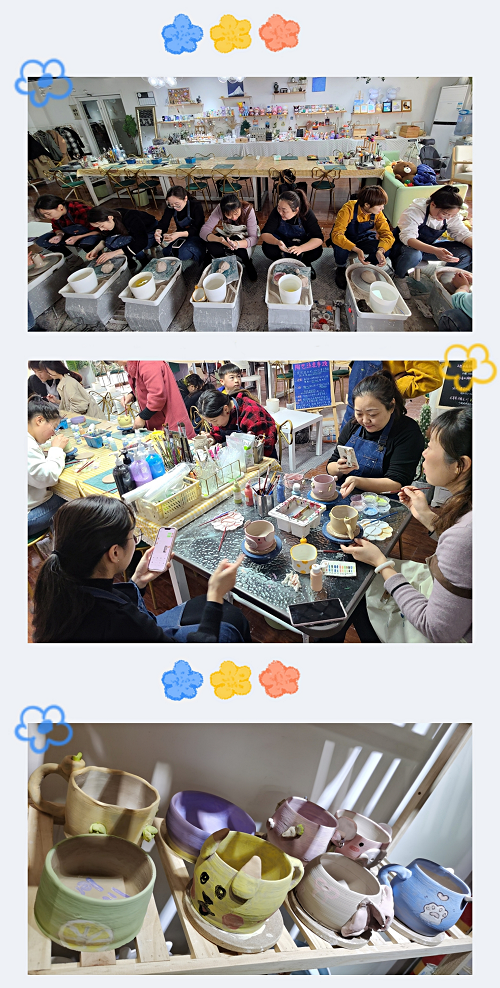 活動(dòng)開始,大家一起參觀了各種各樣、富有特色的陶藝作品,使大家對(duì)“陶藝”產(chǎn)生了濃厚的興趣。首先陶藝?yán)蠋煘榇蠹抑v解了制作過程以及注意事項(xiàng),并演示了捏壓、拉胚、修胚、上色等制作陶藝的步驟。在老師的精心指導(dǎo)下,大家先從一塊無固定形狀的土坯泥塊開始,進(jìn)行練泥、拉坯,只見放置在轉(zhuǎn)盤中心的泥團(tuán),隨手法的屈伸收放,不同形狀的杯子在大家的手中被創(chuàng)造出來。隨后大家用專用顏料在陶體上畫上自己心儀的圖案和彩繪,不一會(huì)兒,陶泥像被賦予了新的生命一般,一朵朵花,一只只小動(dòng)物都躍然于陶藝素胚杯上,原本樸素的陶藝作品頓時(shí)活靈活現(xiàn)。最終一件件獨(dú)具匠心的陶藝作品,展現(xiàn)在大家面前,大家都十分期待早日拿到經(jīng)過上釉和燒制后親手制作的作品。
