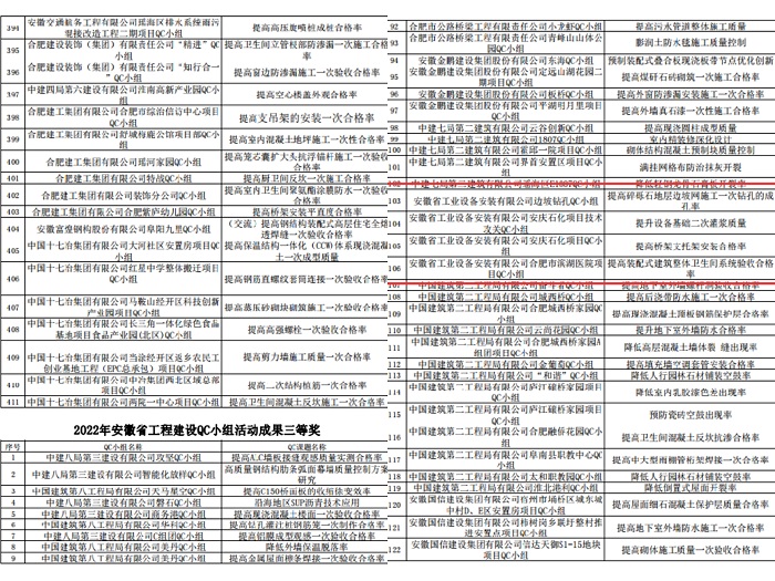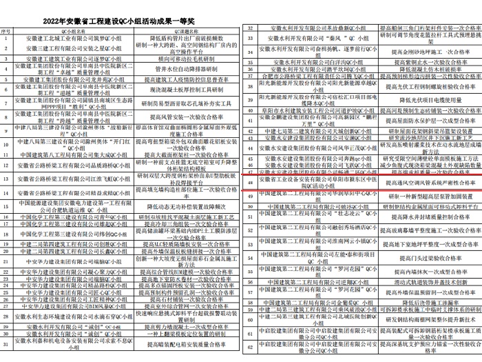 近日,從安徽省建設行業質量與安全協會傳來喜訊,協會發布的《關于2022年安徽省工程質量管理小組及質量信得過班組建設活動成果的通知》文件中,安徽安裝公司共獲得11項安徽省工程建設QC小組活動成果獎項。