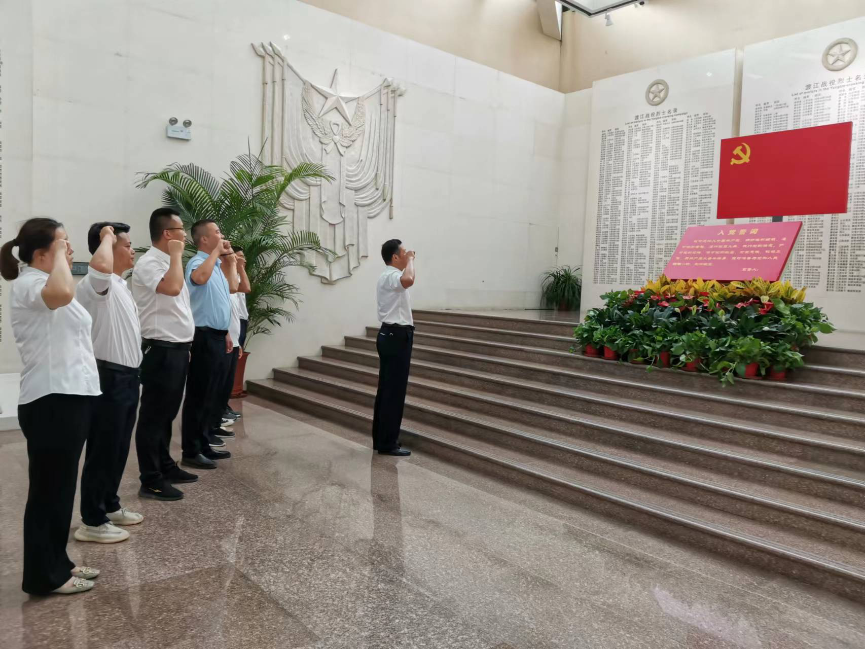 “我志愿加入中國共產黨,擁護黨的綱領,遵守黨的章程,履行黨員義務……”。在渡江戰役紀念館,面對面對鮮紅的黨旗,在分公司黨支部書記胡迎東的帶領下,全體黨員高舉右手,重溫了入黨誓詞再次作出為共產主義奮斗終身的莊重承諾。