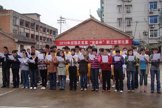 9月28日上午,寂靜已久的公司籃球場(chǎng)熱鬧非凡。由公司工會(huì)主辦的2010年迎國(guó)慶首屆“安裝杯”職工籃球比賽在此拉開(kāi)帷幕。來(lái)自第壹分公司、蚌埠分公司、安慶分公司、公司機(jī)關(guān)的四個(gè)代表隊(duì)和機(jī)關(guān)員工參加了開(kāi)幕式。