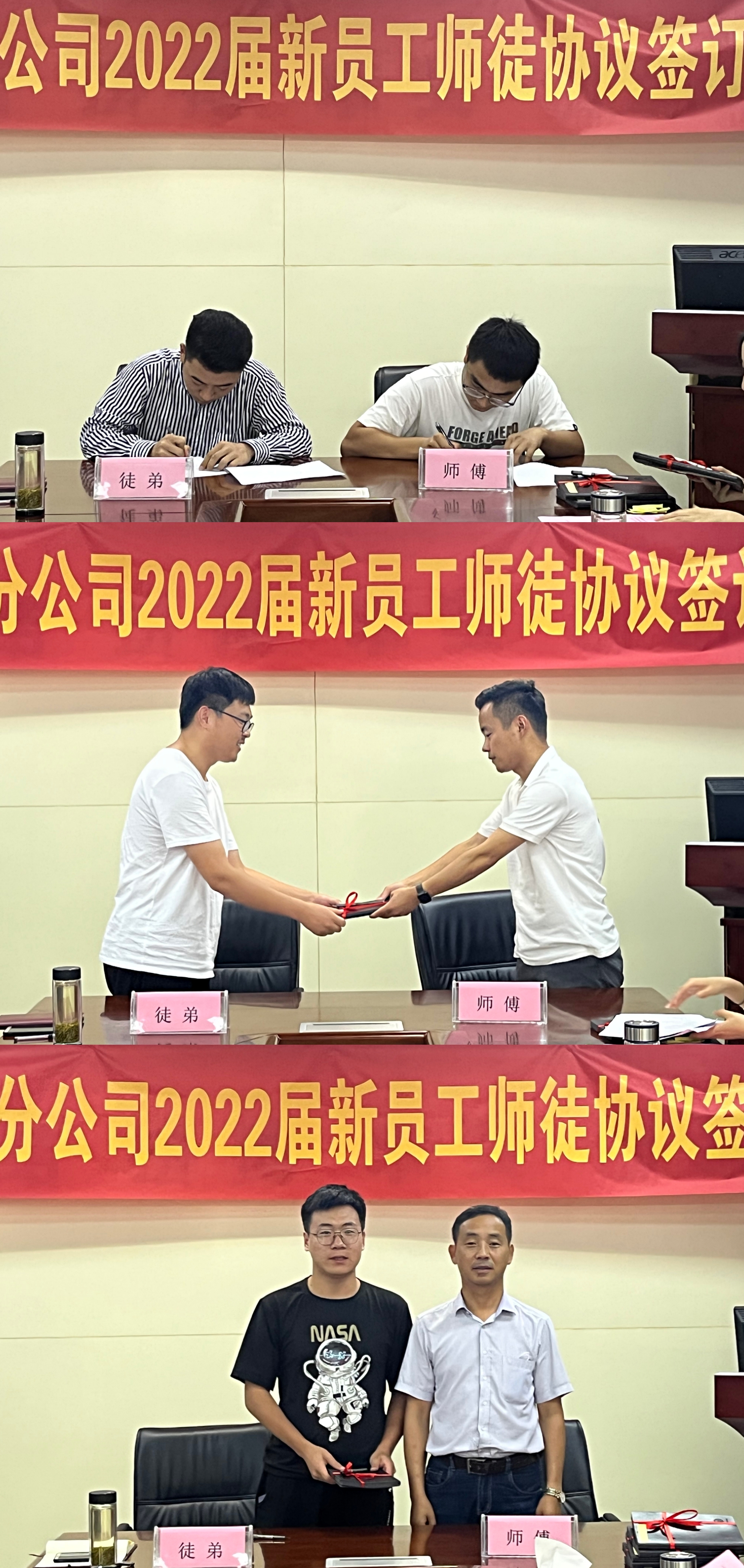 簽約儀式上,分公司黨支部書記程茂麗首先宣讀了分公司六對師徒結(jié)對人員名單。隨后,在與會人員的共同見證下,雙方簽訂師徒協(xié)議,徒弟們謙恭有禮地向師傅行拜師禮,師傅們則將精心準(zhǔn)備的禮物贈送給徒弟,并合影留念。接著,師徒代表分別作表態(tài)發(fā)言。