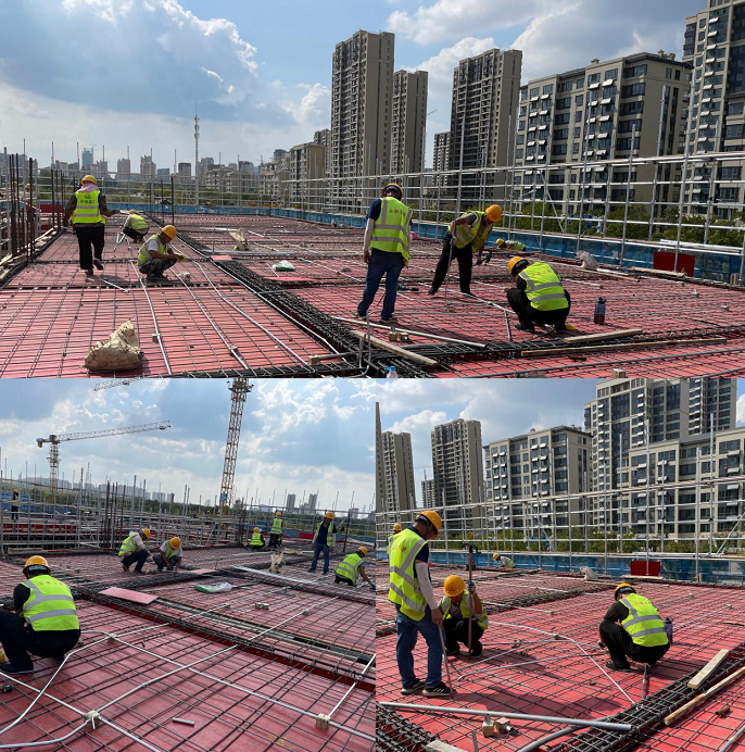 岳西中學項目預埋定點畫線、梁間鋸末清理、水電線管預埋、扎鋼筋