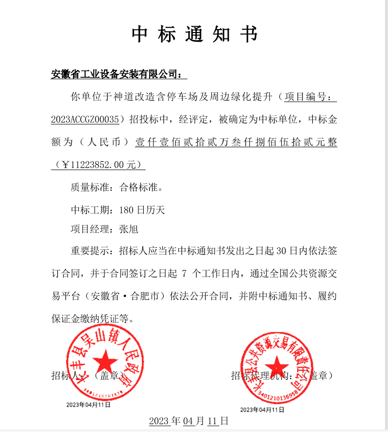 4月11日,安徽安裝市政分公司在合肥市公共資源交易平臺(tái)上投標(biāo)長(zhǎng)豐縣吳山鎮(zhèn)神道改造含停車場(chǎng)及周邊綠化提升項(xiàng)目并一舉中標(biāo),中標(biāo)金額1122.38萬元。這次公招中標(biāo)是分公司繼2022年8月12日廬江立人路項(xiàng)目中標(biāo)后第二次在合肥市公招市場(chǎng)中標(biāo)的市政類項(xiàng)目。