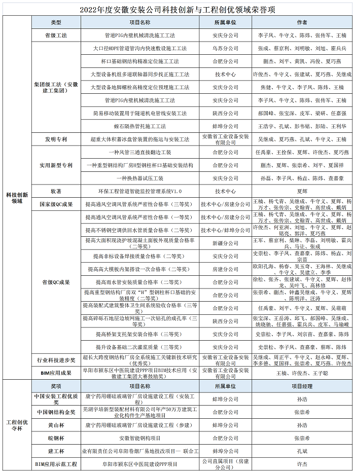 附:2022年度安徽安裝公司科技創(chuàng)新與工程創(chuàng)優(yōu)領域榮譽項