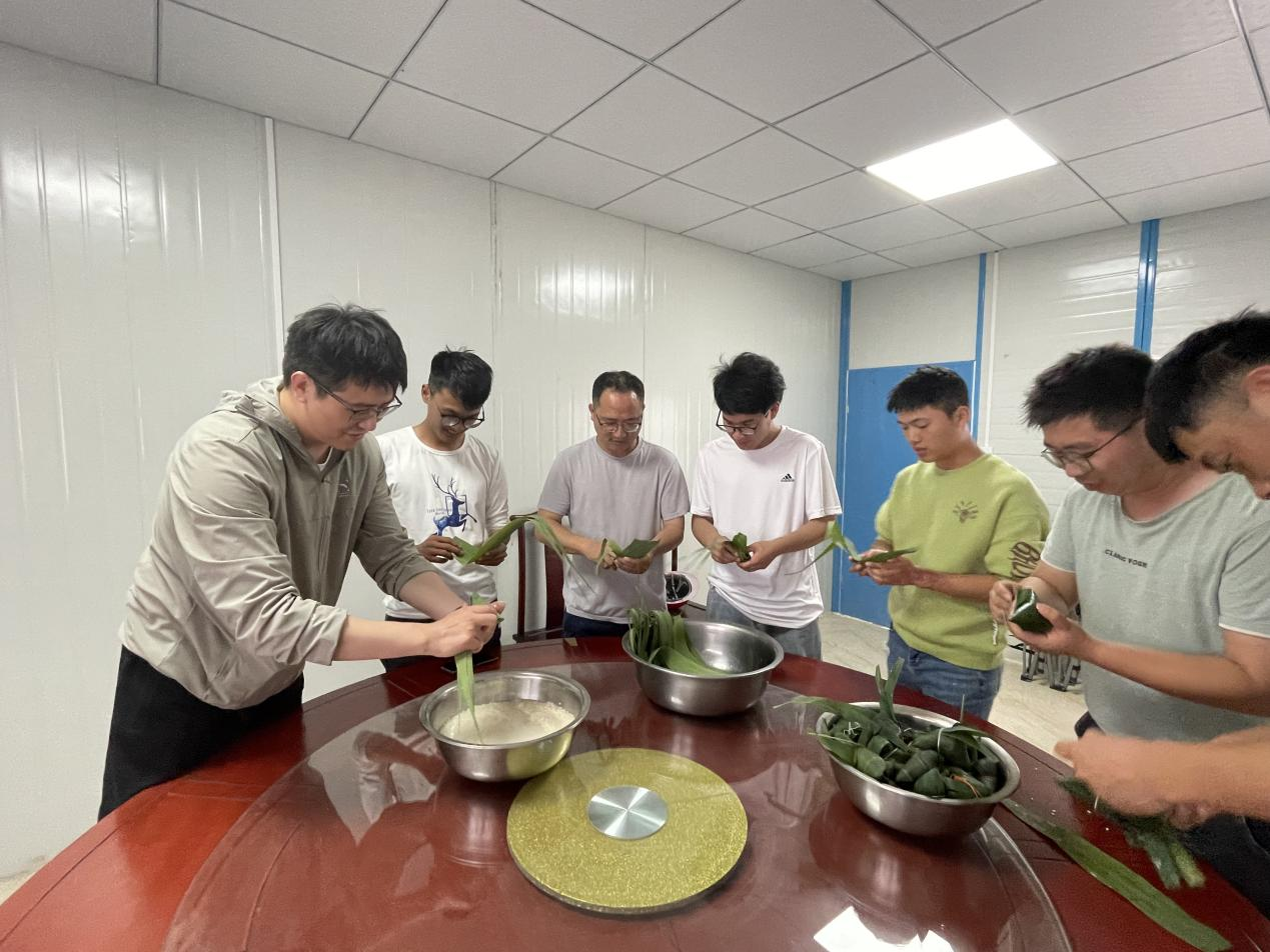 富有經驗的彭韋銘耐心細致地為大家講解了疊粽葉、填料、捆扎等包粽子的詳細流程。大家在一片歡聲笑語中開始了包粽子活動,將粽葉做成漏斗狀,填上糯米,壓實封口,最后捆扎。盡管大部分人都是第一次包粽子,但是大家熱情高漲,每個人包的粽子都有自己的特色。香噴噴的粽子,歡快的活動,緊張的生產,使單調的工地生活增添了色彩。