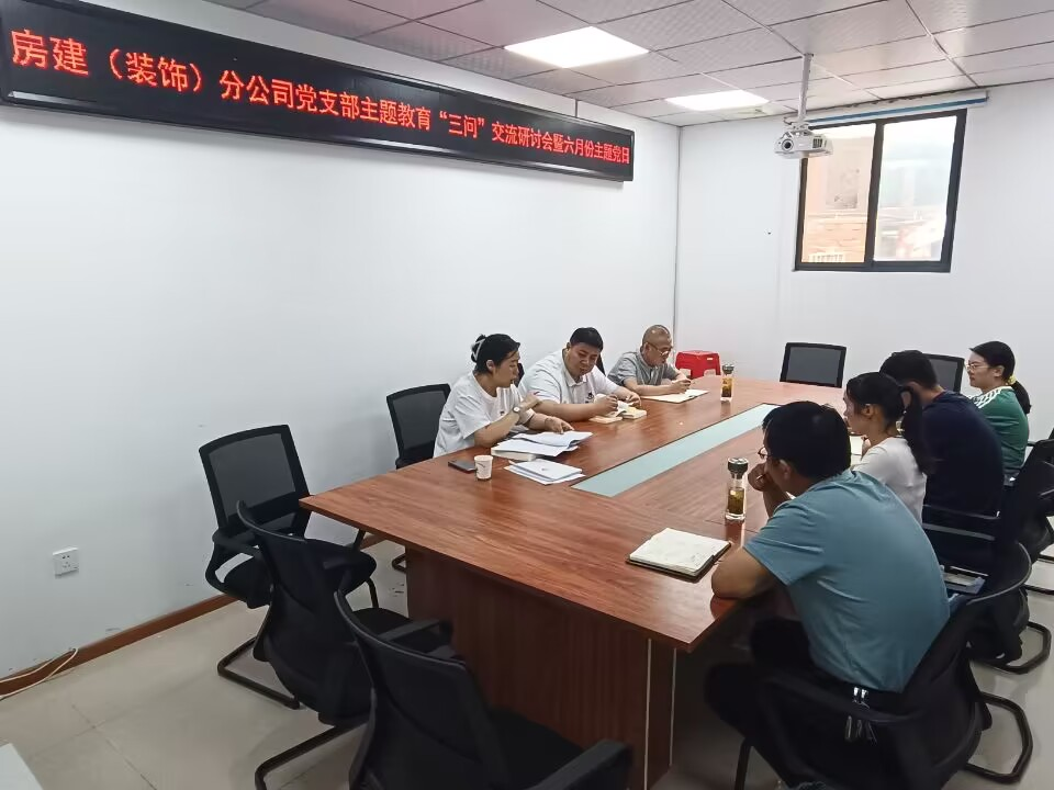 為深入學習貫徹習近平新時代中國特色社會主義思想主題教育,抓實支部理論學習,努力在以學鑄魂、以學增智、以學正風、以學促干方面取得實效。6月16日下午,房建(裝飾)分公司黨支部在會議室組織召開主題教育“三問”交流研討會暨六月份主題黨日活動。會議由支部書記程茂麗主持,支部全體黨員參加。