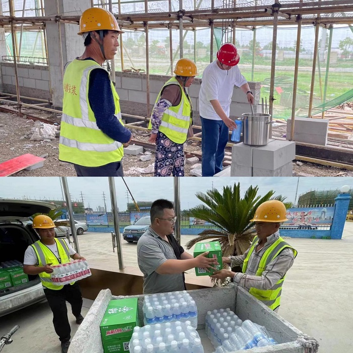 為應(yīng)對(duì)高溫天氣安全施工,項(xiàng)目部提前制定防暑降溫工作方案,管理人員在現(xiàn)場(chǎng)設(shè)置納涼棚為工人提供休息場(chǎng)地,針對(duì)高溫天氣,采取干兩頭避中間,利用夜晚加班等方式全力推進(jìn)施工進(jìn)度。同時(shí)項(xiàng)目后勤保障人員在高溫時(shí)段提供礦泉水、綠茶等清涼解暑飲品,并持續(xù)每天熬制綠豆湯分發(fā)至各班組,為每位員工帶來(lái)絲絲清涼。項(xiàng)目安全科備足人丹、藿香正氣液、十滴水、清涼油、風(fēng)油精等防暑降溫用品,做好高溫天氣施工保障,確保施工安全、高效、有序推進(jìn)。