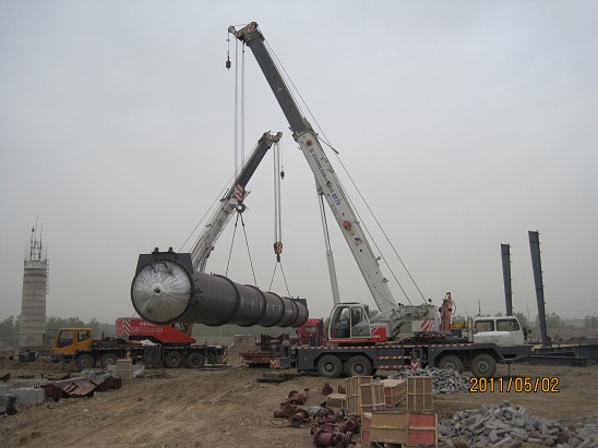 5月1日上午9時許,隨著一陣鞭炮聲響徹鳳陽僑裕新型建材有限公司施工工地,蚌埠分公司承建的鳳陽僑裕8臺蒸壓斧吊裝工作由此拉開了序幕。待安裝蒸壓斧單臺直徑2米、長32米、重約35噸。9點15分,隨著一聲號令,兩臺50T和70T吊車緩緩收鉤,在現場 “起臂、轉臂、扒臂、起鉤、落鉤”等手勢的正確指揮下,第一臺蒸壓斧就象一條巨龍騰空而起,9點25分穩穩地落在預定的位置上,至5月2日11時最后兩臺設備就位,順利完成了全部吊裝任務。本次吊裝作業由于項目部安排得當、組織有力、協調到位,整個吊裝作業安全規范,現場施工井然有序,安徽省安的專業施工能力再次得到檢驗!