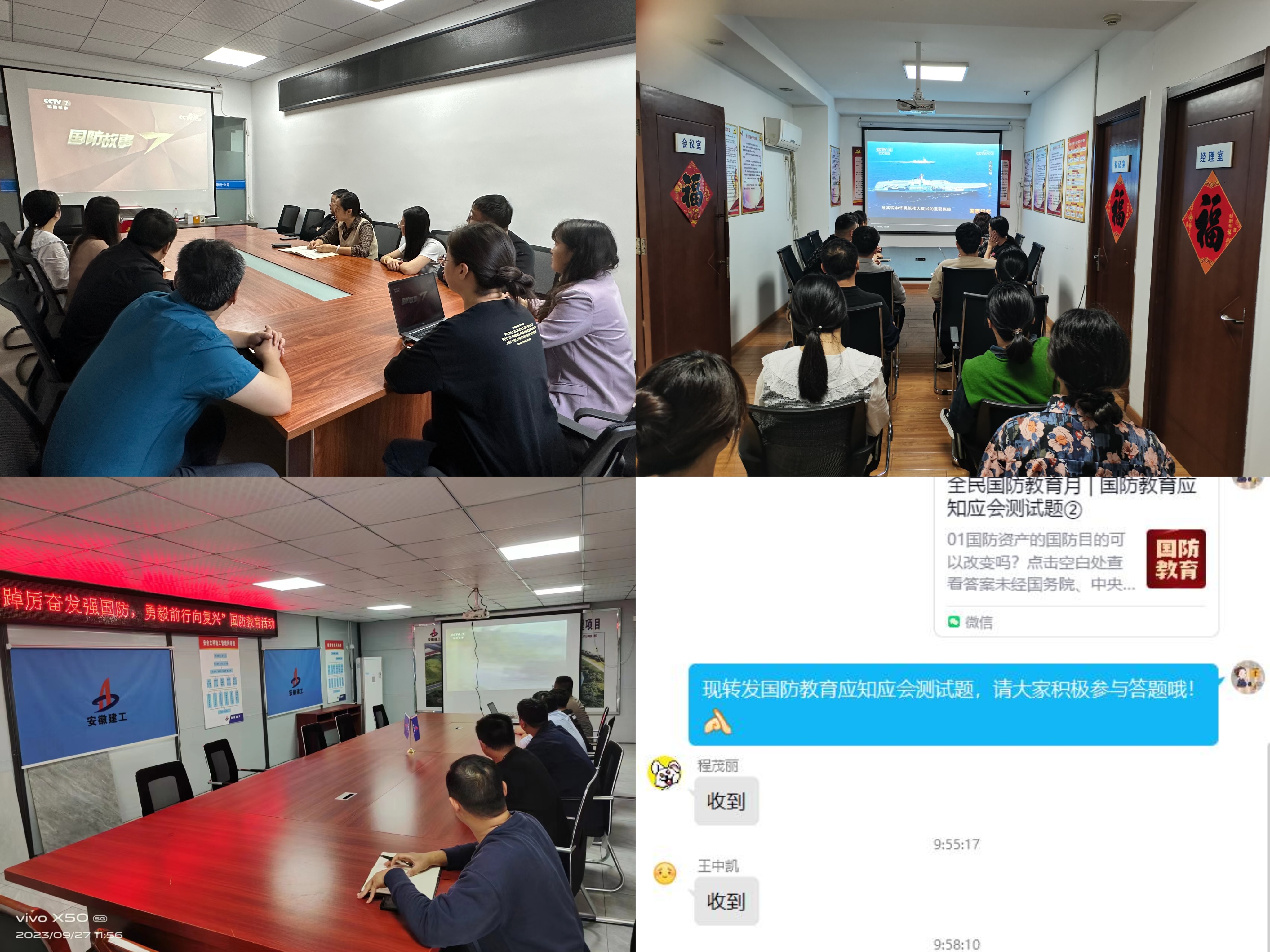公司各級(jí)黨組織通過中心組學(xué)習(xí)會(huì)、紅色教育實(shí)景課堂、退伍軍人職工座談交流、紅色觀影、國防知識(shí)問答等多種形式,營造出關(guān)心國防、熱愛國防、建設(shè)國防、保衛(wèi)國防的濃厚氛圍,廣大職工紛紛表示要樹立國防觀念,賡續(xù)紅色血脈,立足崗位、恪盡職守、錘煉本領(lǐng),為推進(jìn)奮力開創(chuàng)安徽建工集團(tuán)大發(fā)展、轉(zhuǎn)型發(fā)展、高質(zhì)量發(fā)展新局面而不懈奮斗。
