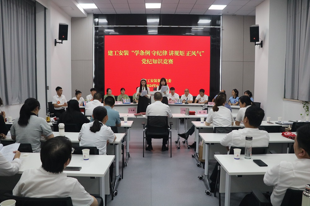 6月27日下午,建工安裝集團(tuán)舉辦“學(xué)條例 守紀(jì)律 講規(guī)矩 正風(fēng)氣”黨紀(jì)知識(shí)競賽。公司黨委委員、紀(jì)委書記李楊,黨委委員、副總經(jīng)理董雙武,黨委委員、副總經(jīng)理樊剛出席活動(dòng),各黨支部書記、機(jī)關(guān)部門負(fù)責(zé)人以及參賽選手等40余人參加活動(dòng)。