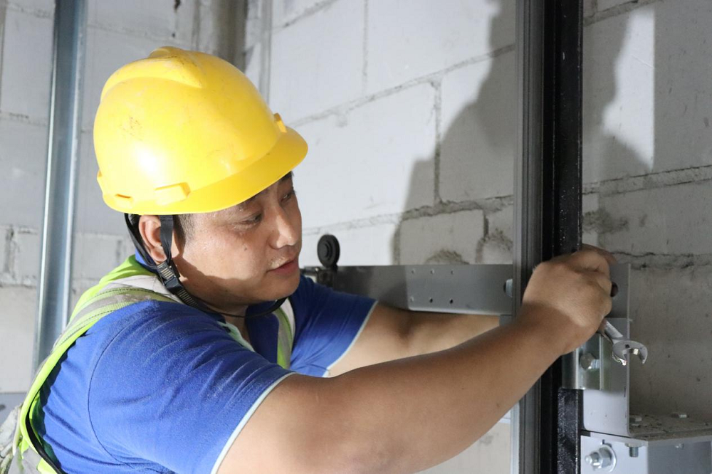 蚌埠傳感谷(寧波蚌埠微電子產業園一期)項目施工人員正在安裝電梯轎廂門