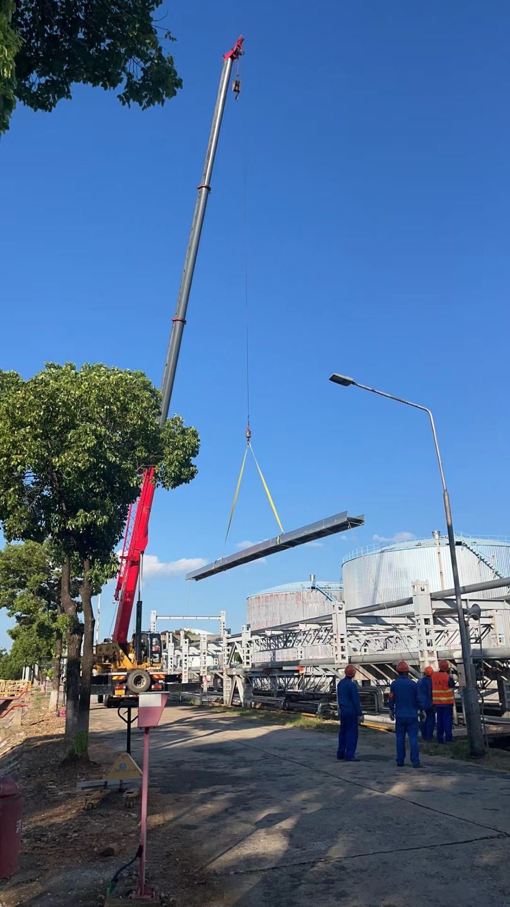 8月1日,該項(xiàng)目進(jìn)行電纜槽盒托架吊裝工作,該電纜槽盒托架采用18米每段進(jìn)行吊裝,先集中預(yù)制后到現(xiàn)場管廊處進(jìn)行對(duì)接后在吊裝至管廊上。該托架重量約0.6噸,使用1臺(tái)25噸吊車,將整段托架吊至上方,并對(duì)接安裝連接成一個(gè)整體。在項(xiàng)目部全體人員的共同努力下托架順利吊裝到位,該托架吊裝完成標(biāo)志著此項(xiàng)目安裝工作進(jìn)入尾聲,為項(xiàng)目按時(shí)完工奠定了良好的基礎(chǔ),目前正在進(jìn)行電纜橋架吊裝和電纜鋪設(shè)工作。