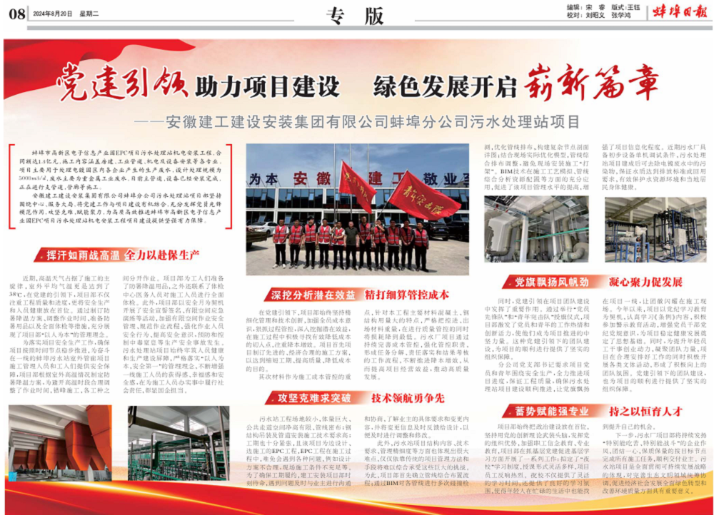 媒體專版報道了建工安裝蚌埠分公司高新區電子信息產業園EPC項目污水處理站機電安裝工程項目的基本概況,以及該項目抓黨建、保生產、降成本、強技術、育人才等方面的成功經驗和做法。