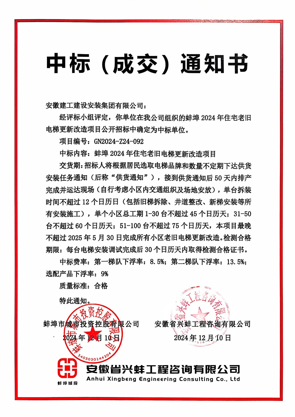 12月10日,建工安裝電梯分公司成功收到蚌埠2024年住宅老舊電梯更新改造項(xiàng)目中標(biāo)通知書(shū)!