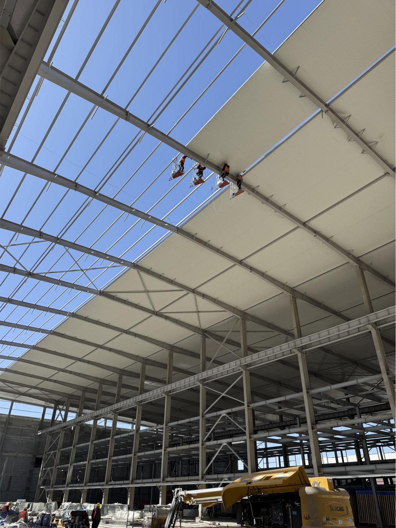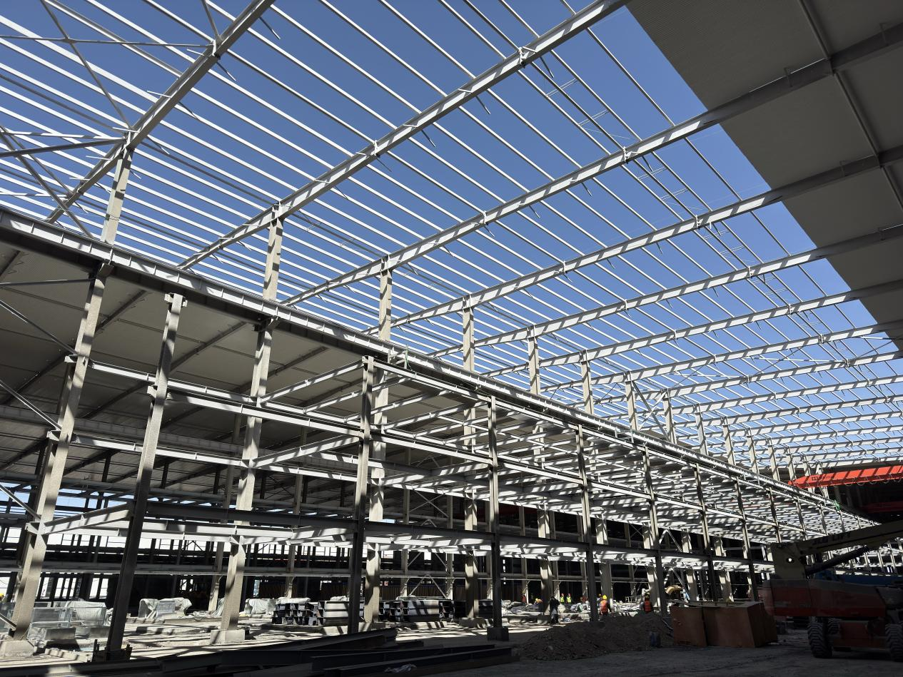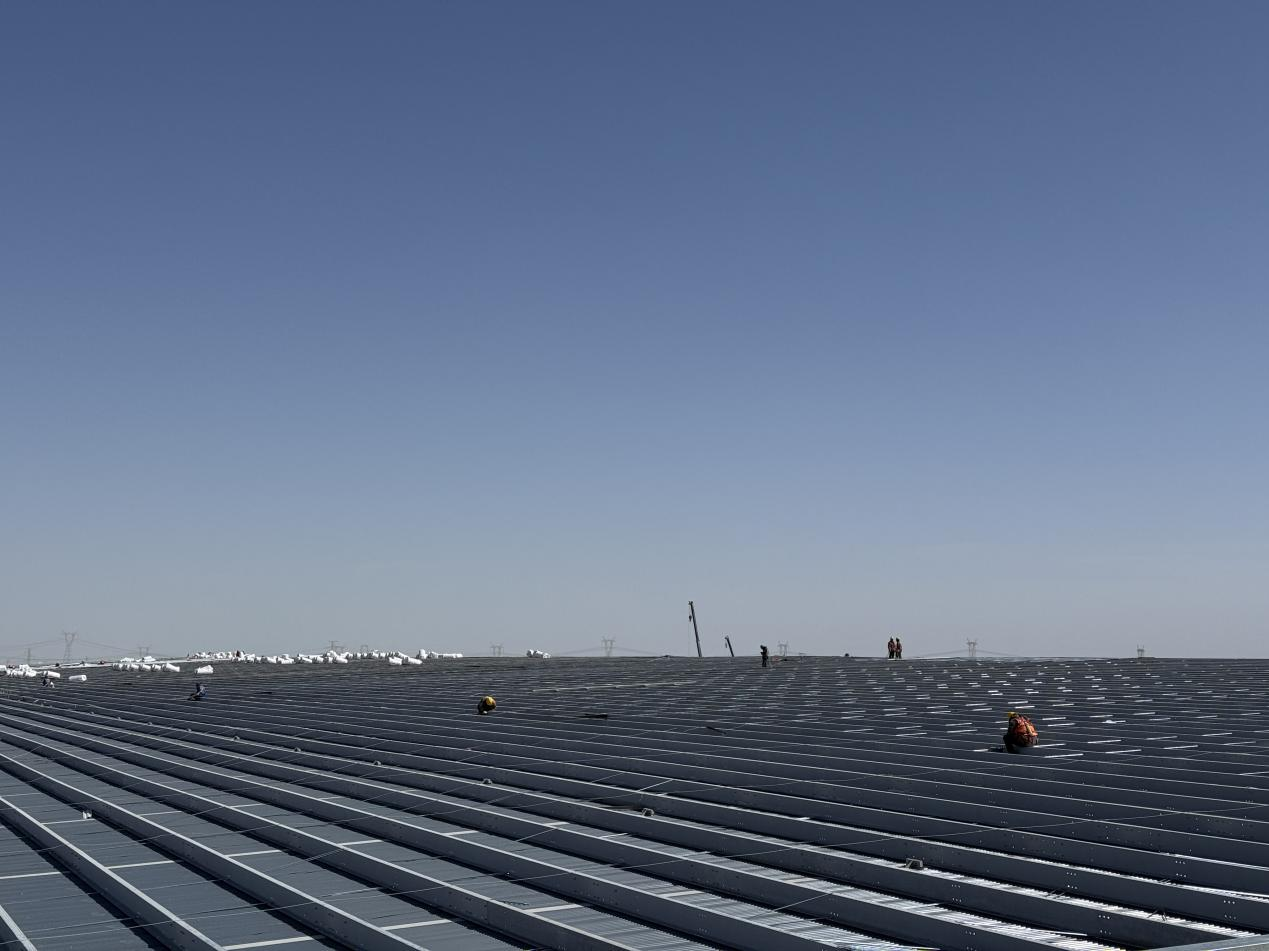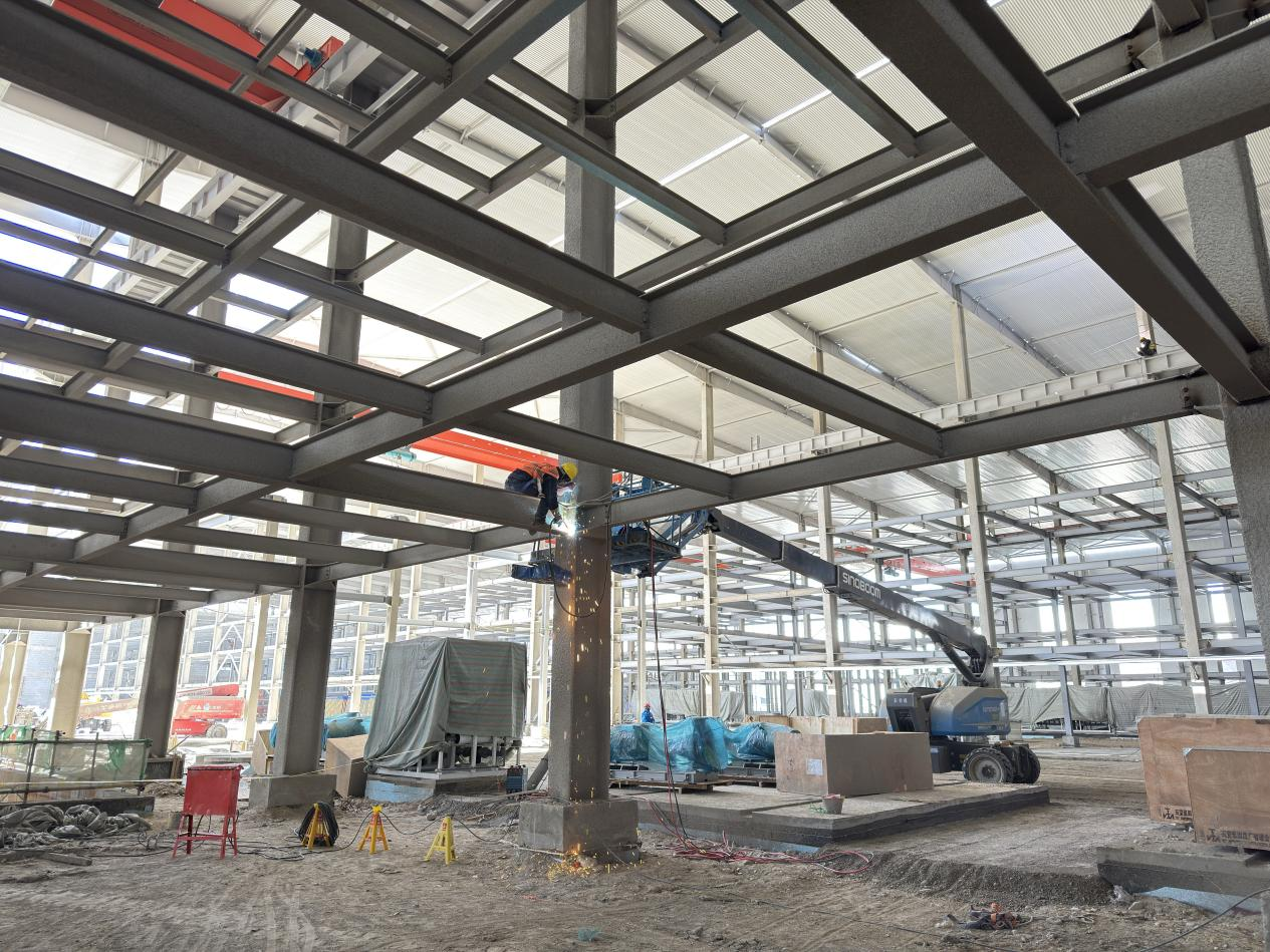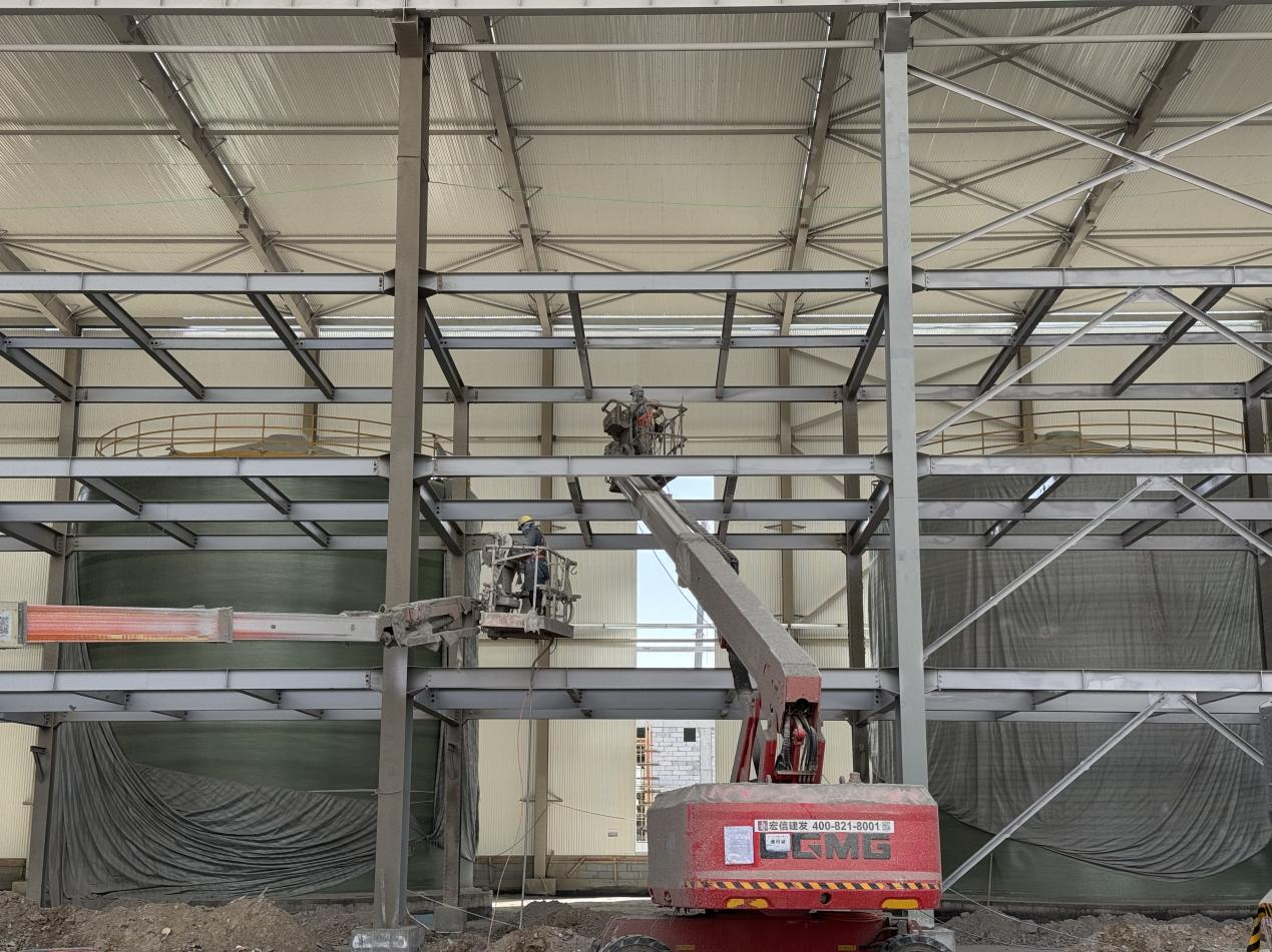 項目地處高海拔鹽湖區,缺氧且淡水匱乏,施工環境惡劣,資源保障困難。面對不利因素,項目團隊迎難而上,積極尋找解決方案,為項目順利推進筑牢基礎。截至目前,項目已取得顯著階段性成果,廠房主鋼構全部完成,管廊鋼結構完成約95%,防火涂料完成80%,屋面及墻面圍護結構完成約50%,配電房裝飾裝修工作有序進行,各項任務按計劃穩步推進。