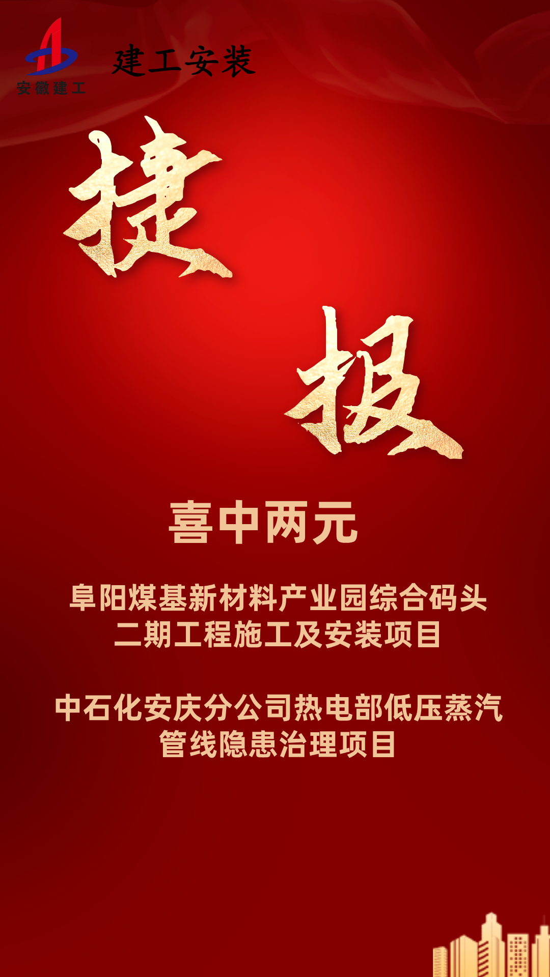 近期,建工安裝喜中兩元,成功中標阜陽煤基新材料產業(yè)園綜合碼頭二期工程施工及安裝項目以及中石化安慶分公司熱電部低壓蒸汽管線隱患治理項目,中標總金額5400萬元。